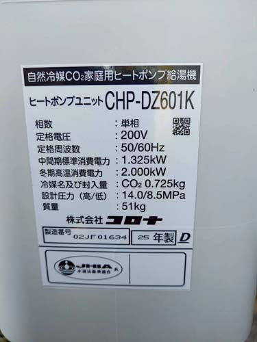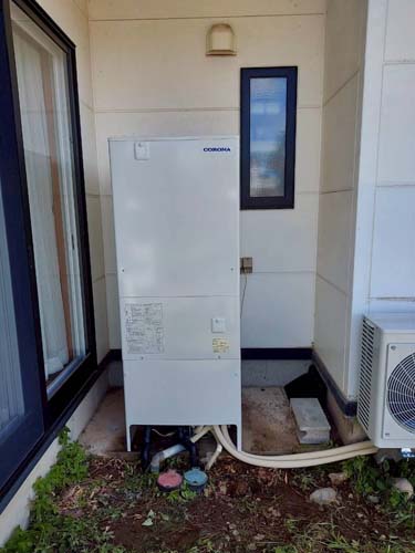松戸市根本 コロナ自然冷媒CO2家庭用ヒートポンプ給湯機 ヒートポンプユニットCHP-DZ601K、貯湯ユニットCTU-46AZ1K エコキュート交換工事